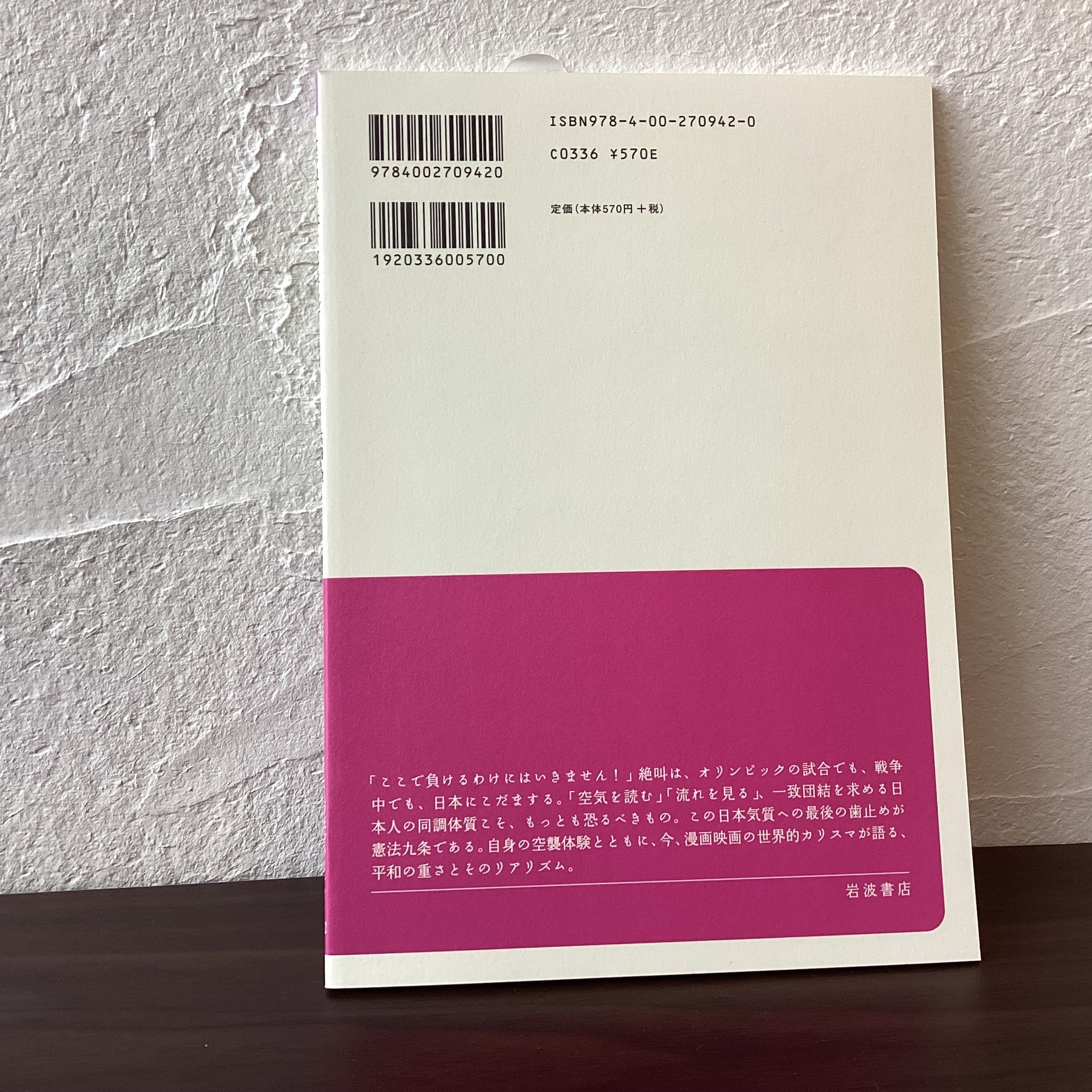 【版元サイトより】「ここで負けるわけにはいきません!」絶叫は,オリンピックの試合でも,戦争中でも,日本にこだまする.一致団結を求める日本人の同調気質こそ,もっとも恐るべきもの.この日本気質への最後の歯止めが憲法九条である.今,漫画映画の世界的カリスマが語る,平和の重さとそのリアリズム.ナンセンスなことを「ナンセンス」と言うために.
